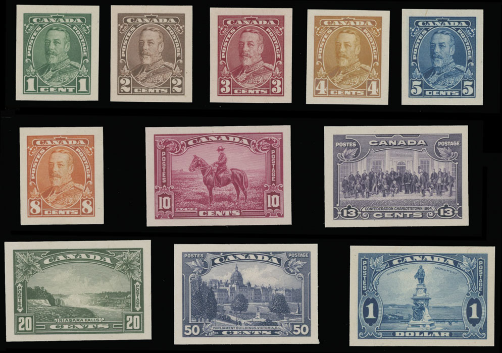 1935, imperforate plate proofs of 1c-$1, complete set of 11 printed on India paper mounted on cards, nice and fresh, no gum as issued, NH, VF, Unitrade C.v. CAD $1,800, Est. $500-$600 , Scott #217-27