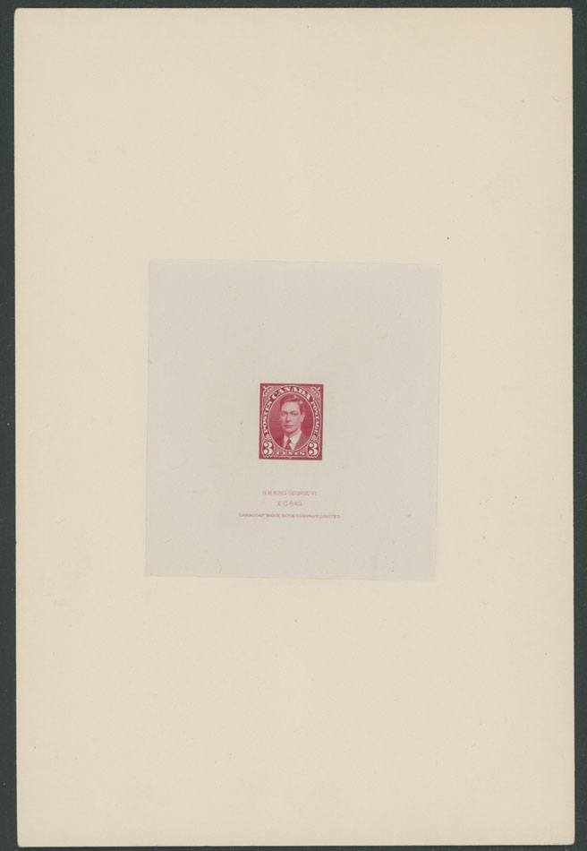 1937, Mufti issue, large die proof of 3c in bright carmine on India paper placed on sunken die large card, imprint at bottom reads: ”H.M. King George VI. X-G-649. Canadian Banknote Company, Limited”, proof size 80x87mm, fresh, VF and rare, Minuse and Pratt #233P1, NSSC 194 dp8, C.v. US$1,200, Est. $600-$700, Scott #233