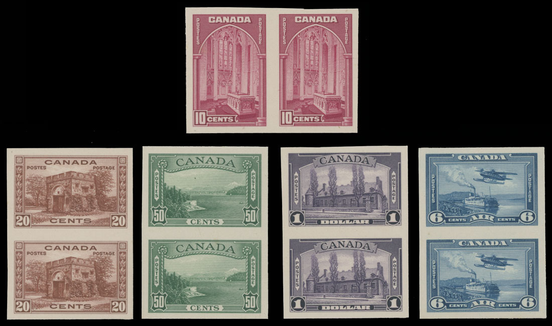 1938, Pictorial issue, imperforate plate proofs of 10c- $1 and air mail stamp of 6c, complete set of five in horizontal (10c) or vertical pairs, printed on India paper and mounted on cards, no gum as produced, NH, VF, Unitrade C.v. CAD$1,600++, Est. $500-$600, Scott #241-45, C6