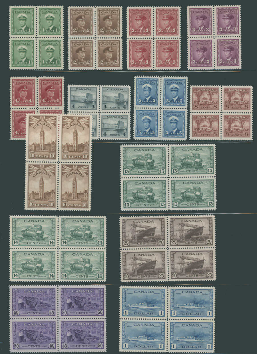 1942-43, War issue, 1c-8c, 10c-$1, complete set of 14 in blocks of four, premium centering, full OG, NH, VF, Unitrade C.v. CAD$1,370++, Est. $500-$600 , Scott #249-62