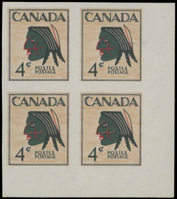 1953(c), Indian Head imperforate essay of proposed design for multicolored 4c definitive stamp, bottom right corner sheet margin block of four, printed on gummed stamp paper, NH, VF, Est. $400-$500