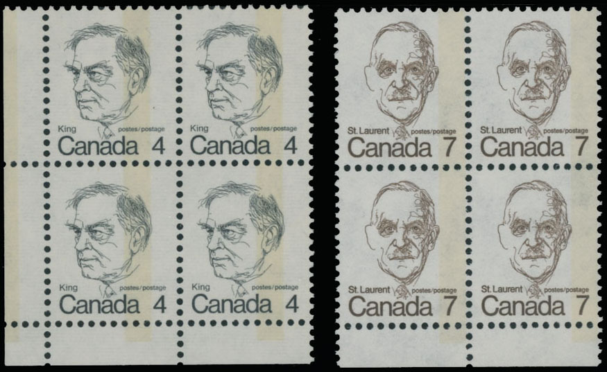 1974, King 4c black on horizontally ribbed paper, one line tagging in center, type T1; St. Laurent 7c dark brown, one line tagging at right, type T1, two sheet margin blocks of four, full OG, NH, VF, Tagging Errors Cat. $320++, Est. $150-$180 , Scott #589, 592 var