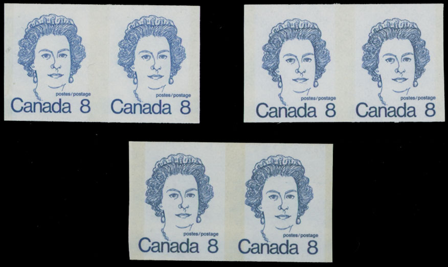 1974, Queen Elizabeth II, 8c blue, three imperforate pairs of coil stamps, 8c blue, printed on three different types of paper – low fluorescence (LF), hibrite (HB) and dull fluorescence (DF), full OG, NH, VF, Unitrade #604a, iii, v, C.v. CAD$725, Est. $250-$300, Scott #604a, var