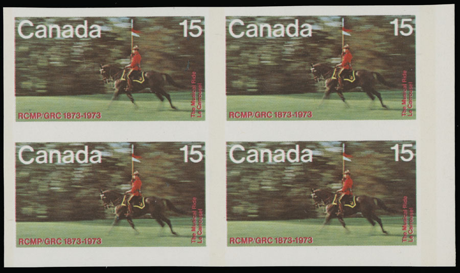 1973, R.C.M.P. Musical Ride, 15c multicolored, bottom right corner sheet margin imperforate block of four (no inscription), flawless quality, full OG, NH, VF, Unitrade C.v. CAD$1,500, Est. $400-$450 , Scott #614a
