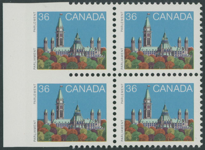 1987, Parliament Buildings, 36c multicolored, left sheet margin block of four, left pair is partly imperforate, full OG, NH, VF, Unitrade #926Bii, C.v. CAD$1,000, Est. $300-$350 , Scott #926B var