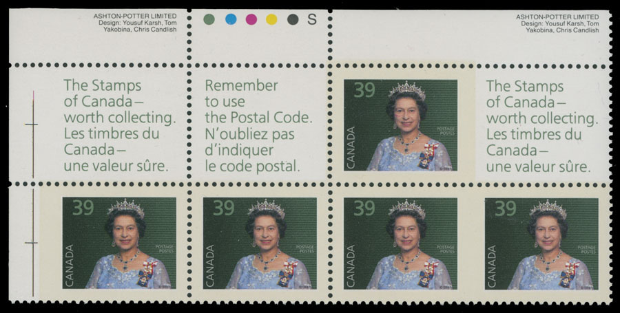 1990, Queen Elizabeth II, 39c multicolored with green background, top part of wrong layout of booklet pane with imprint and color signs, containing five single stamps and three labels (4×2), imperforate at left and between 3rd and 4th rows, full OG, NH, VF, Unitrade C.v. CAD$1,100 for pair imperf between and stamp and label imperf between, a single and label with imperf margin is not listed, Est. $300 -$350, Scott #1167d, var