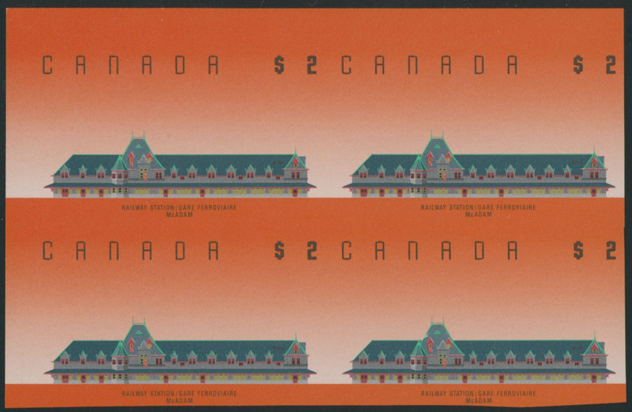 1989, McAdam Railway Station, $2 multicolored with orange background, top left corner sheet margin imperforate block of four, full OG, NH, VF and rare multiple, C.v. $1,700++, Unitrade C.v. $2,500, Est. $900-$1,000 , Scott #1182a