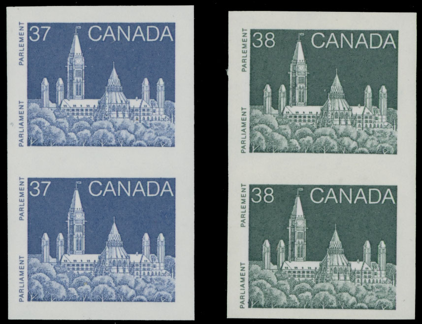 1989, Parliament Buildings, 37c blue and 38c dark green, two vertical imperforate pairs of coil stamps, printed medium fluorescence or dull fluorescence paper, full OG, NH, VF, Unitrade #1194v, Ae, C.v. CAD$725, Est. $200- $250 , Scott #1194 var, Ae