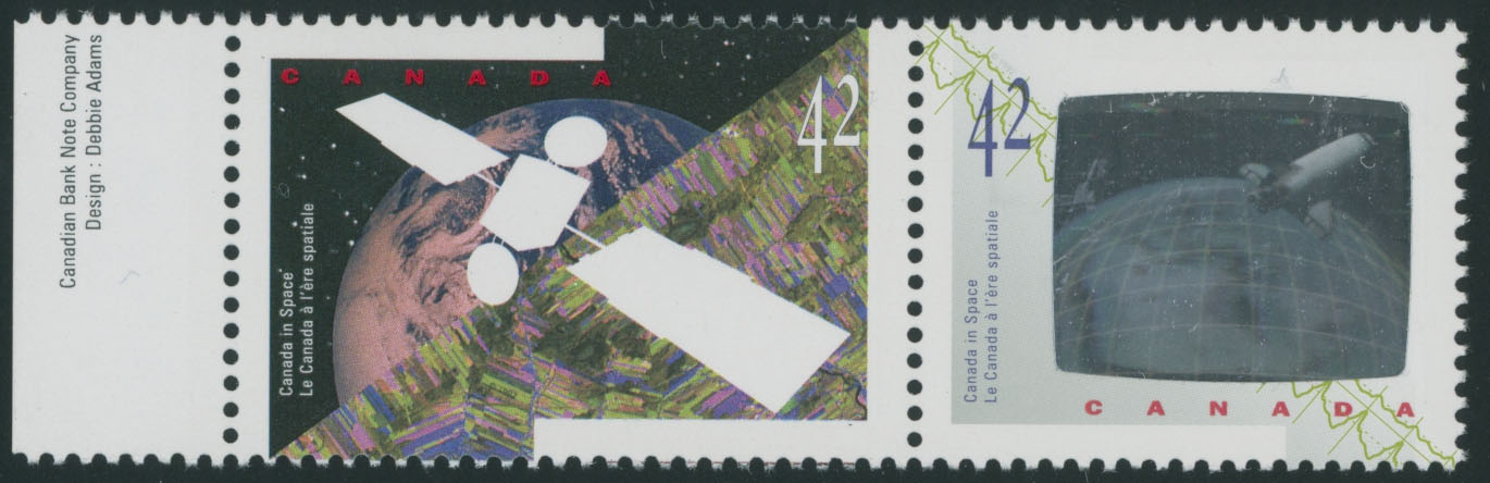 1992, Canada in Space, 42c x2 multicolored, left sheet margin horizontal se-tenant pair, left stamps have silver color omitted, part of marginal imprint, full OG, NH, VF and very rare, reportedly the only pane of 20 with omitted silver (10 stamps) was discovered, a copy of V. Greene certificate for the pane, C.v. $2,750, Unitrade C.v. CAD $3,750, Est. $1,500-$2,000, Scott #1441a