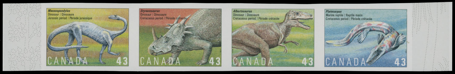 1993, Prehistoric Animals, the third issue, 43c multicolored, imperforate side margin horizontal se-tenant strip of four, full OG, NH, VF and very rare, only a few panes of 20 has been recorded, C.v. $2,500, Unitrade C.v. CAD$4,000, Est. $1,500-$1,800, Scott #1498b