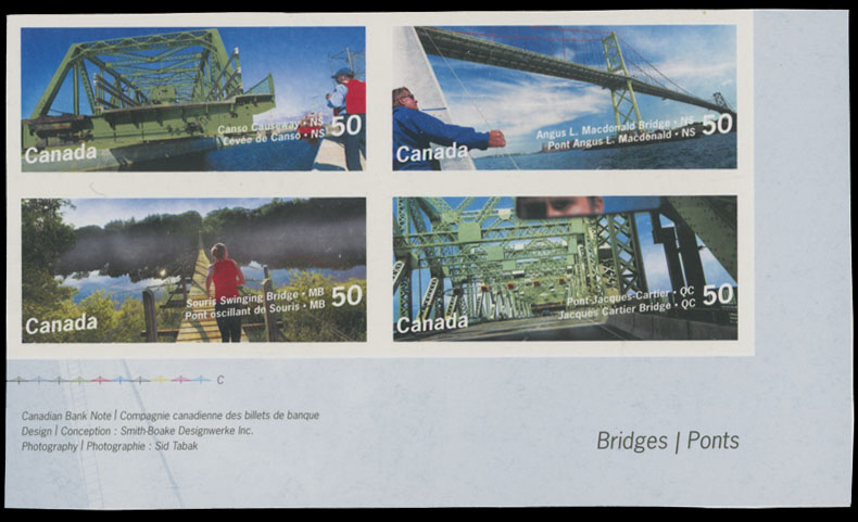 2005, Canadian Bridges, 50c x4 multicolored, bottom right corner sheet margin self-adhesive se-tenant block of four, die cutting omitted (imperforate) variety, C.v. $1,500; Unitrade C.v. CAD$2,000, Est. $600-$700 , Scott #2103b
