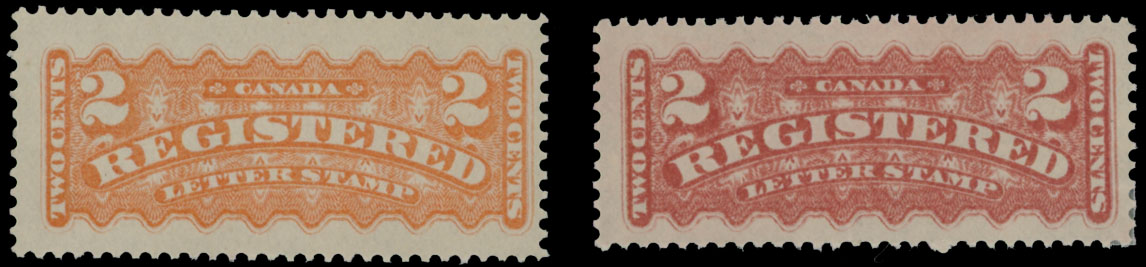 1875-88, 2c orange and 2c rose carmine, full OG, NH or VLH at bottom right corner, F/VF, Unitrade C.v. CAD$725, Est. $300-$400 , Scott #F1, b