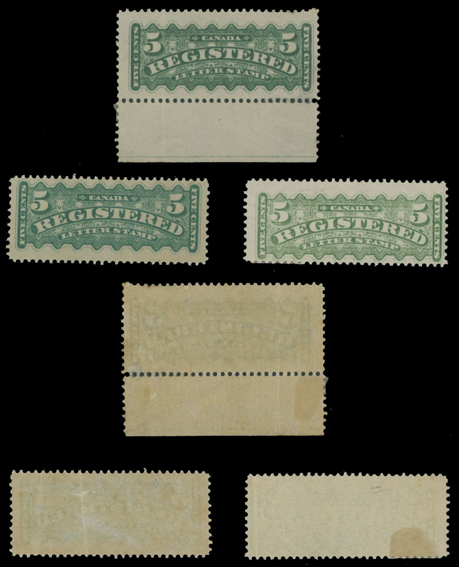 1876, three stamps of 5c, dark green, blue green and pale yellow green, first one with bottom margin, full of OG with minor usual disturbance, NH (F2, a) or previously hinged, F/VF and scarce unit, Unitrade C.v. CAD$860, Est. $300-$400 , Scott #F2, a, b