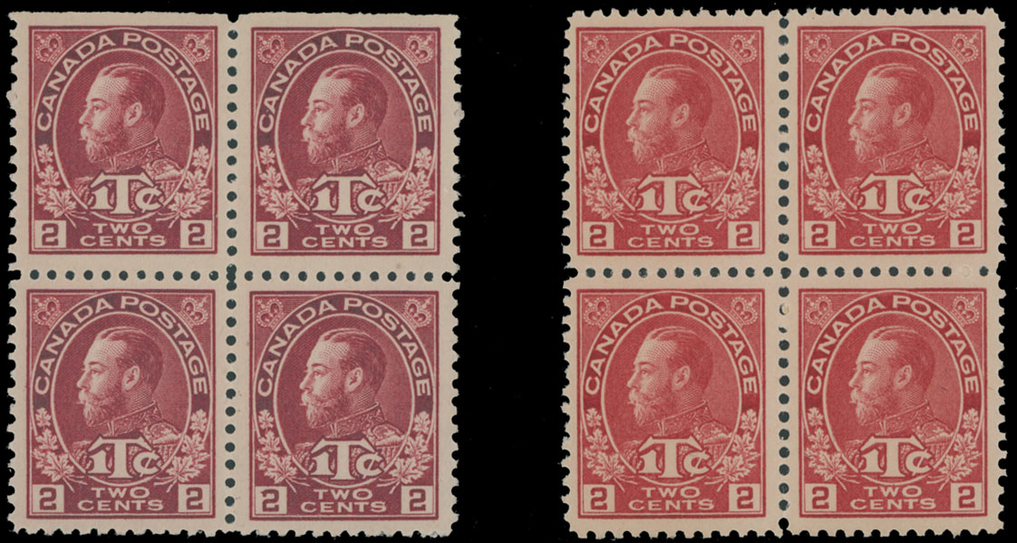 1916, King George V, ”1Tc” inscription, two blocks of four, 2c+1c dark carmine and 2c+1c rose red, both are Die I, nicely centered with intact perforation, full OG, NH, VF, C.v. $1,110++, Unitrade C.v. CAD$1,620 as singles, Est. $500-$600 , Scott #MR3, b