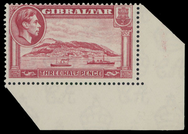1940, King George VI and View of the Rock of Gibraltar, 1½p carmine, perforation 13½, bottom right corner sheet margin single, full OG, NH, VF, C.v. $190 as hinged, SG #123a, C.v. £300, Est. $200-$250 , Scott #109b