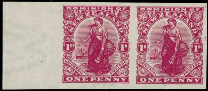 1909-12, Universal Penny Postage, Commerce, 1p carmine, left sheet margin horizontal imperforate pair on chalk-surfaced paper, watermark single NZ and Star with part of printer’s watermark on the selvage, full OG, NH, VF and scarce, C.v. $375, SG #405a, C.v. £500, both catalog values for a hinged item, Est. $400-$450, Scott #131a