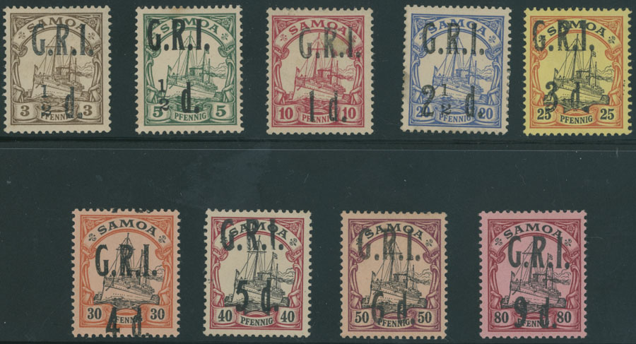 1914, black surcharge ”G.R.I.” and new denominations on stamps of German Samoa, ½d/3pf – 9d/80pf, set of nine, full/large part of OG, F/VF, guaranteed genuine, C.v. $925, SG #101/09, C.v. £970, Est. $600-$700, Scott #101-09