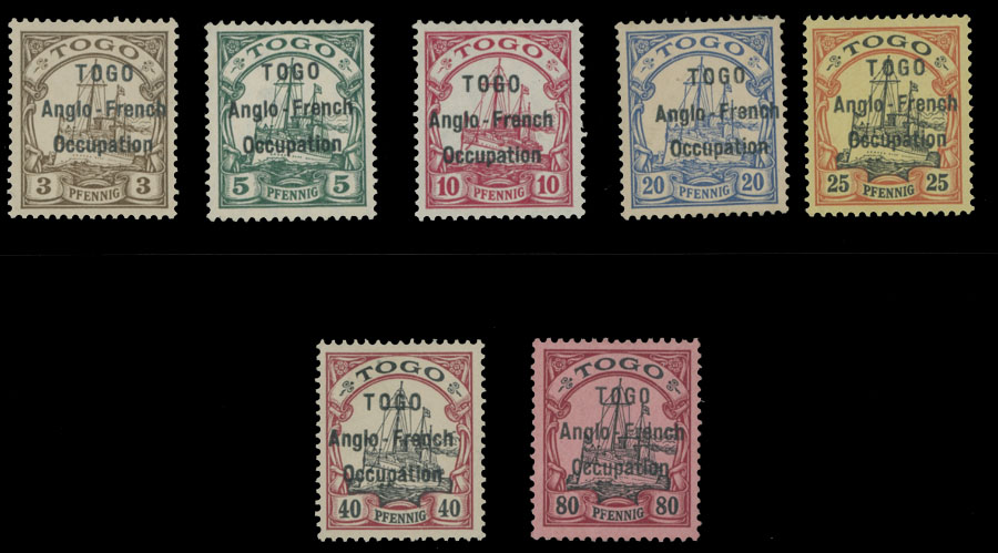 1914, black overprint (wide 3mm setting) on German Togo stamps of 3pf-25pf, 40pf and 80pf, full OG, NH (3pf, 25pf) pr LH/hinged, VF, 5pf and 10pf with H. Bloch certificates, C.v. $972, SG #H1/9, C.v.£1,080, both values as hinged, Est. $600-700, Scott #35/43
