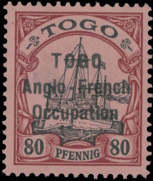 1914, narrow setting (2mm) black overprint on German Togo stamp of 80pf red and black on pink paper, full OG, NH(!), VF and very rare, expert’s sign on reverse, C.v. $3,250, SG #H22, £3,250 both values as hinged, Est. $3,000-$3,500 , Scott #56