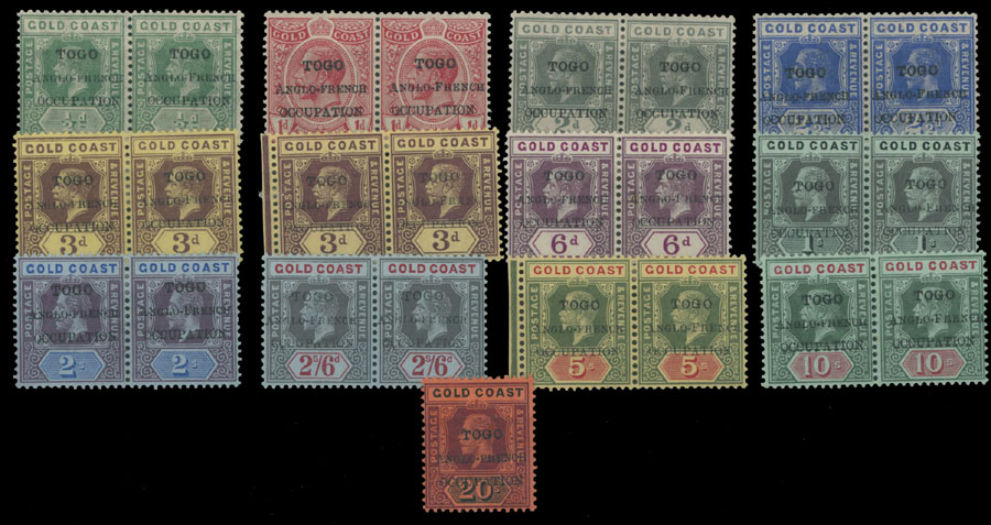 1915, black overprints with short word ”Occupation” on Gold Coast stamps of ½p-20s, complete set of 13 with both 3p stamps, including 12 pairs with large and small ”F” of ”French”, a single of 20s has small ”F”, full/large part of OG, mostly VF and rare unit, A. Roumet certificate, SG #H34/46, a, C.v. is over £1,150, Est. $500 -$600, Scott #66-78, var