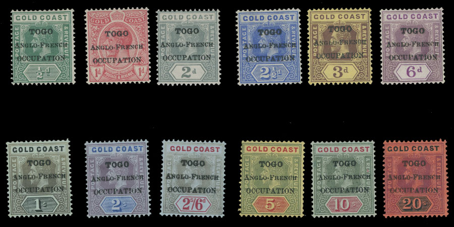 1916, black London overprints with ”Occupation” 15mm long, on Gold Coast stamps, ½p-20s, complete set of 12, full OG, a few NH, others LH, VF, SG #H47/58, C.v. £325 as hinged, Est. $250-$300 , Scott #80-91