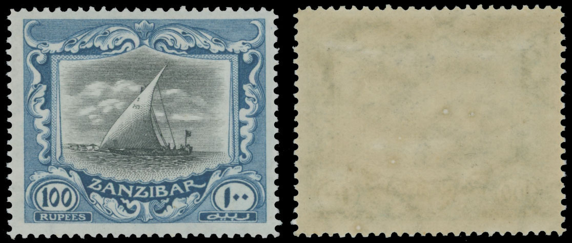 1913, Dhow, 100r blue and black, sideways watermark Multiple Rosettes, nice stamp in every respect, full OG, NH, mostly VF and rare, C.v. $1,000, SG #260f, C.v. £1,200, both values as hinged, Est. $1,200-$1,500 , Scott #139