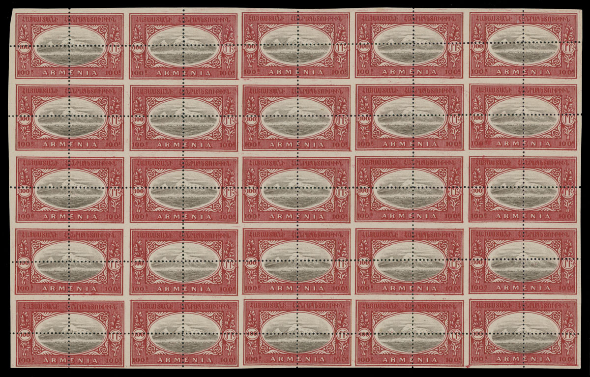 1920, Paris issue, Ararat Mountain, imperforate plate proof of 100r in red and black brown (issued colors), block of 25 with vertical and horizontal perforation misplaced to the design, no gum as issued, VF and scarce genuine multiple, Artar #609P, Est. $300-$400