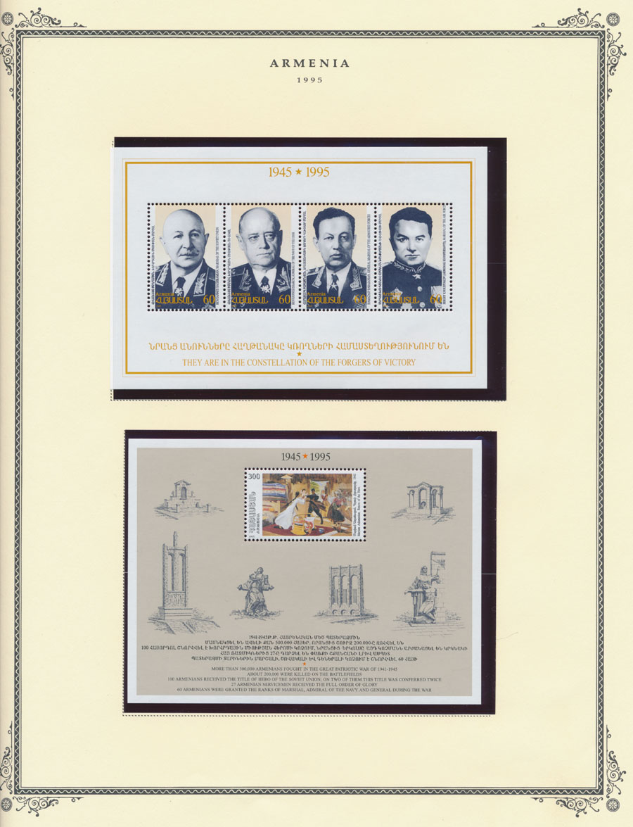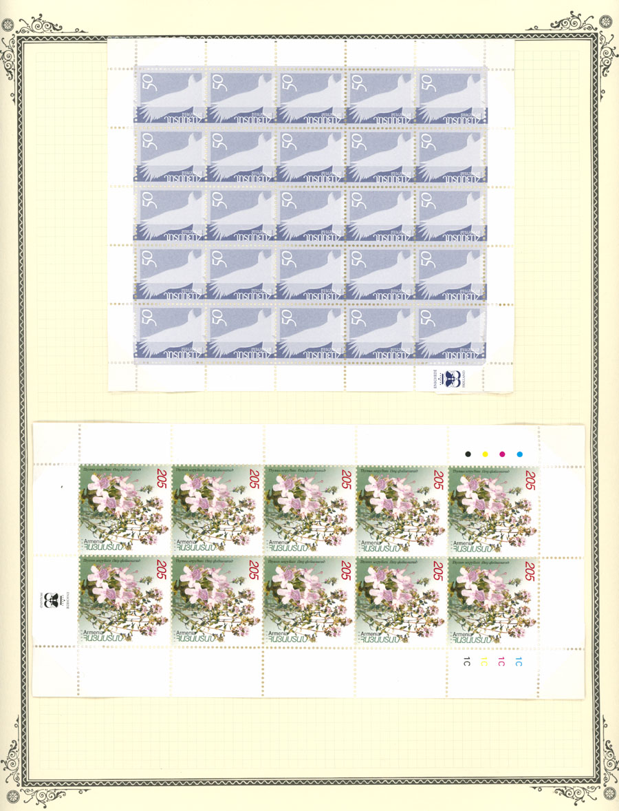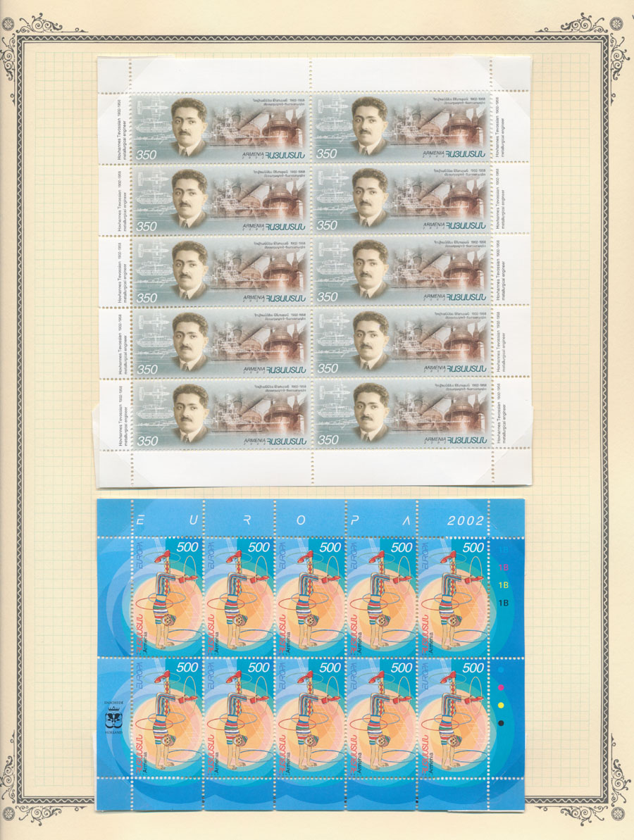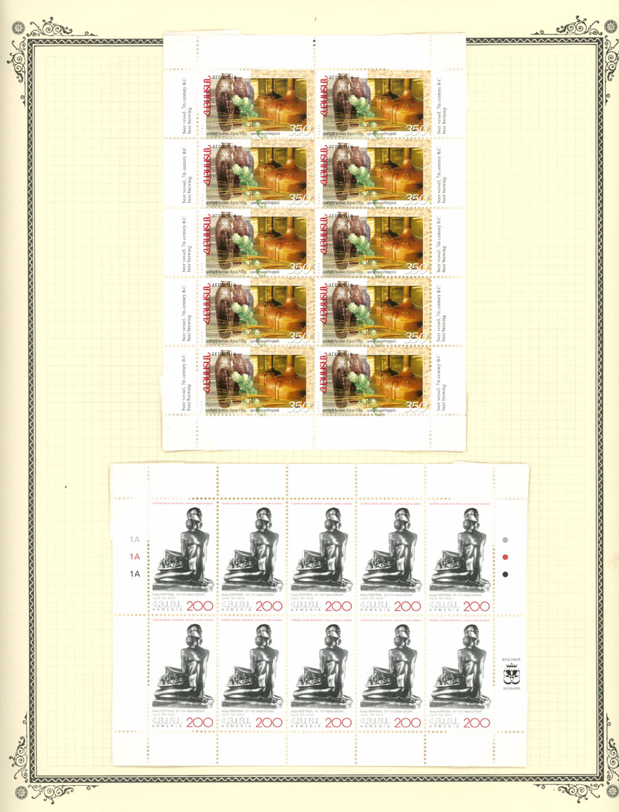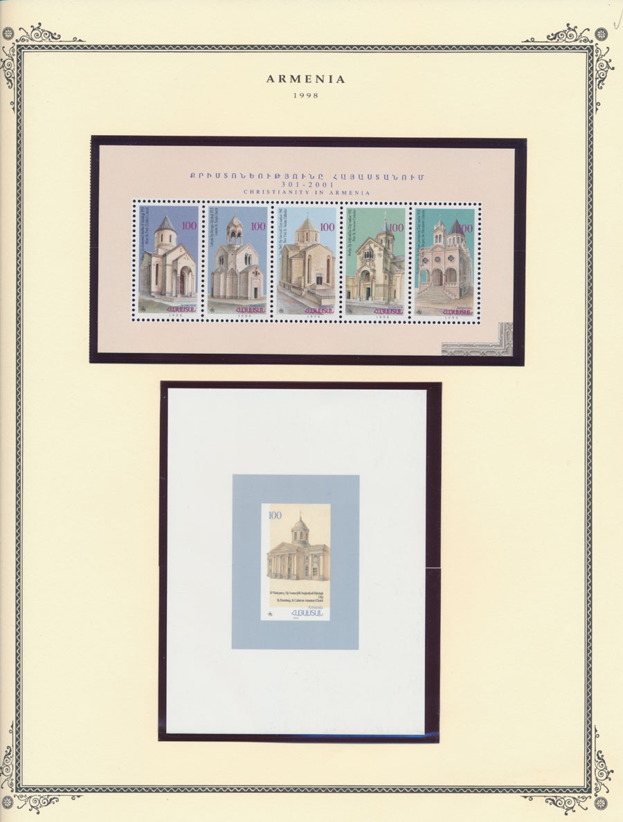 1992-2003, 384 mint stamps, 62 miniature and 35 souvenir sheets, arranged on Scott album and stockpages, practically complete, including imperforate Chess and Tigran Petrosian sets in pairs and blocks of four, numerous miniature sheets, official and unofficial stamps in commemoration of Spitak Earthquake, as well as Nagorno-Karabakh stamps, including some bogus issues, full OG, NH, VF, C.v. $2,250 for listed items, Est. $500-$600