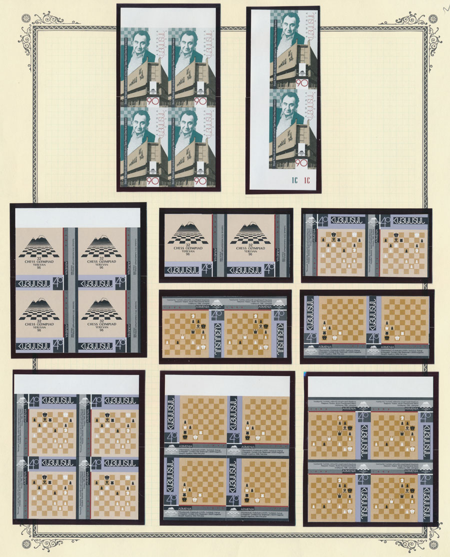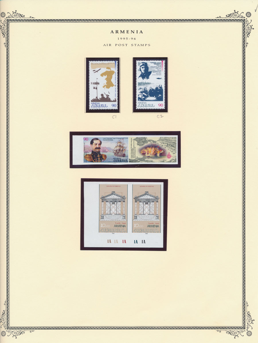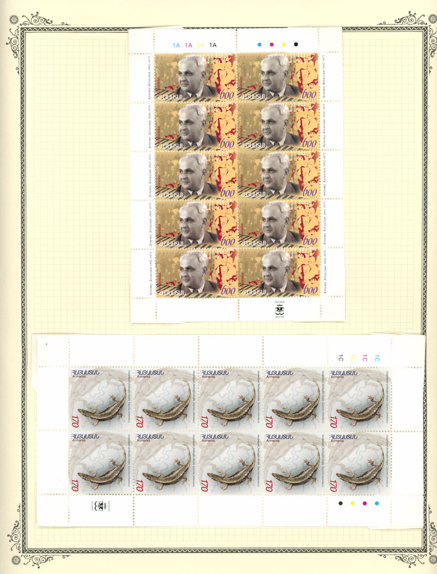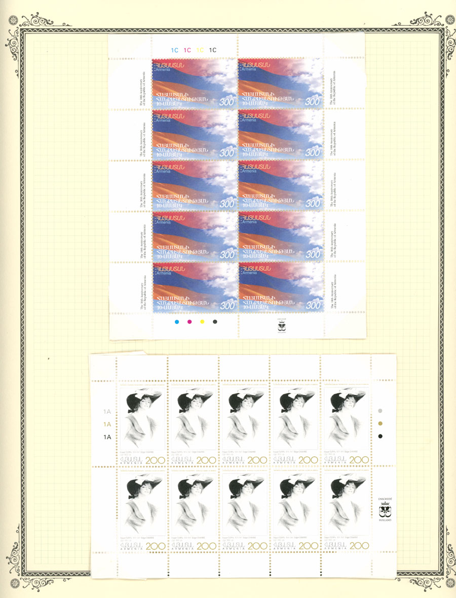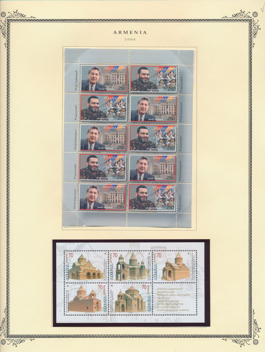 1992-2003, 384 mint stamps, 62 miniature and 35 souvenir sheets, arranged on Scott album and stockpages, practically complete, including imperforate Chess and Tigran Petrosian sets in pairs and blocks of four, numerous miniature sheets, official and unofficial stamps in commemoration of Spitak Earthquake, as well as Nagorno-Karabakh stamps, including some bogus issues, full OG, NH, VF, C.v. $2,250 for listed items, Est. $500-$600