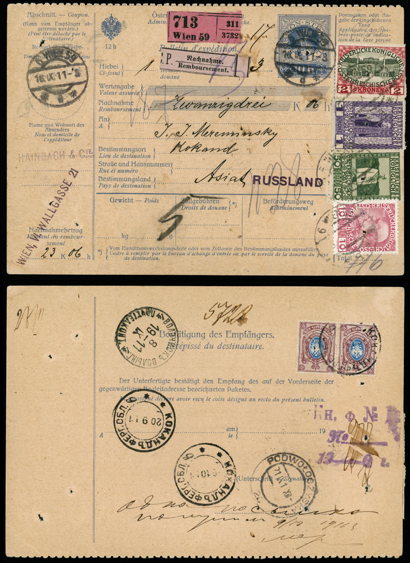 1911, Austro-Hungarian stationery parcel card 10h blue for 23.06kr, uprated by four definitive stamps and sent to Kokand (Russian Middle Asia) via Podwoloczyska (then Austrian Galicia) and Volochysk (then Volyn Gub.), upon arrival uprated by horizontal pair of Russian 15k brown lilac and blue, tied by Kokand date stamps, all adhesives with pinholes for security purposes, otherwise very fine and rare destination and franking item, Est. $400-$500, Scott #115b, 121, 124‑25