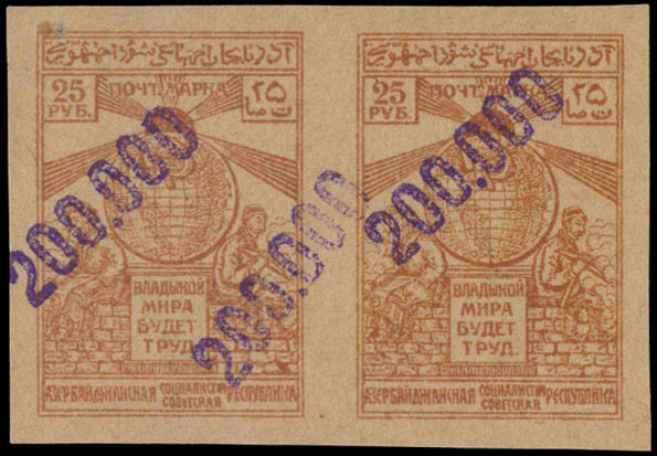 1922, violet rubber handstamp 200,000(r) on Soviet issue stamp of 25r orange brown, horizontal pair bearing three surcharges, natural inclusion at the top left, no gum as issued, NH, VF, State Collection guarantee hs, C.v. $160 as for two common singles, Est. $150-$200, Scott #68 var