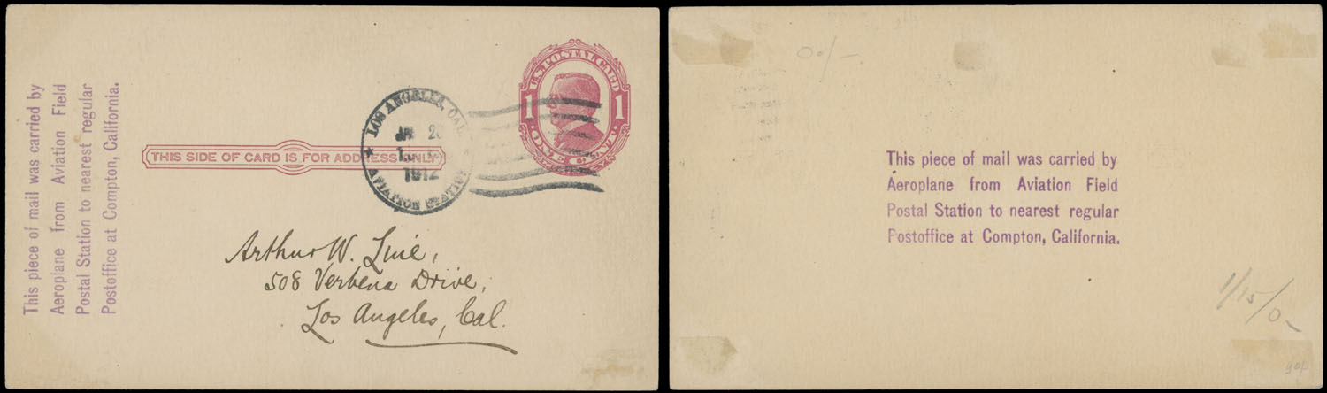 1912 (January 20-28), Dominguez Field Aviation Meet (Las Angeles, CA), stationery post card 1c rose delivered from the Meet to the city of Compton Post Office (about 4 miles) per LA Postmaster William H. Harrison approval, four-line confirmation cachet, traces of mounts on reverse, still F/VF, Est. $150-$180