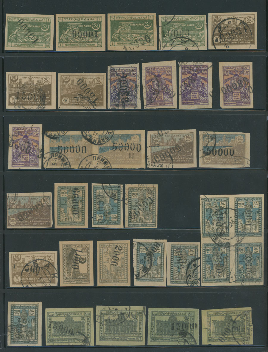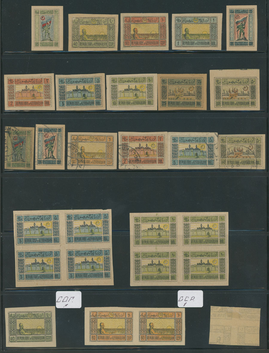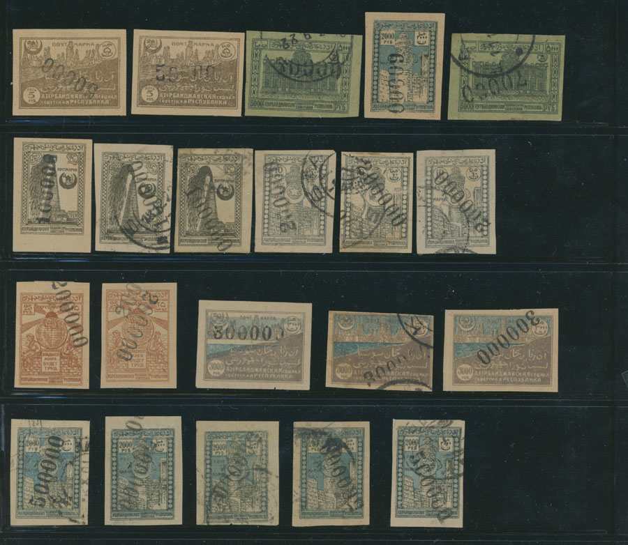 1919-23, over 100 mint and used stamps, starting with Musavat issue on white and yellow gray paper, including some printing and plate errors and 55 various handstamps, among them 30 with double or inverted surcharges, fresh condition overall, mainly no gum as issued or used, F/VF and scarce assemblage, C.v. $2,660, Est. $500-$600, Scott #1-10, 32/51 var
