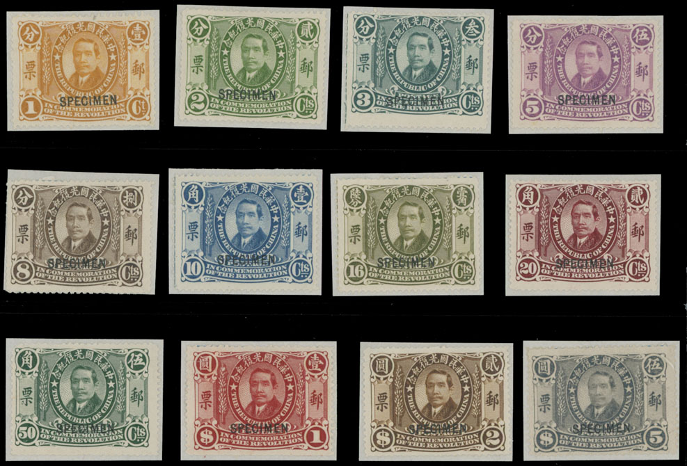 1912, Dr. Sun Yat-sen, 1c-$5, complete set of 12, each value with black horizontal overprint Specimen, individually arranged on small pieces, full/large part of OG, F/VF and very rare, Est. $2,000-$2,500 , Scott #178-89