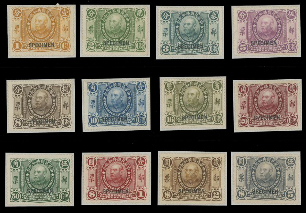 1912, President Yuan Shih-Kai, 1c-$5, complete set of 12, each value with black horizontal overprint Specimen, individually mounted on small pieces, traces of OG, F/VF and very rare, Est. $1,500-$2,000 , Scott #190-201