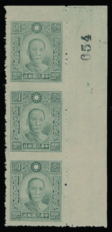 1946, Dr. Sun Yat-sen, $20 blue green, rough perforation 12½, top right corner sheet margin plate No. vertical strip of three imperforated at top and between stamps, no gum as issued, NH, VF, Chan #622e, Est.$200-$250 , Scott #519 var