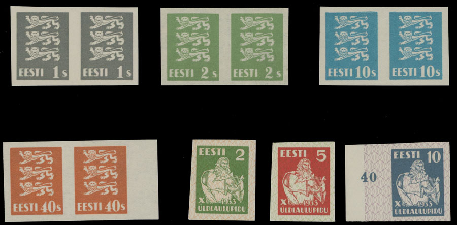 1926-33, Coat of Arms, imperforate plate proofs of 1s gray, 2s green, 10s blue and 40s orange, horizontal pairs printed on white paper without network, in addition Song Festival imperforate set of three, full OG, NH or LH (pair of 10s), VF, Est. $200-$250, Scott #90/95, 113-15 imp