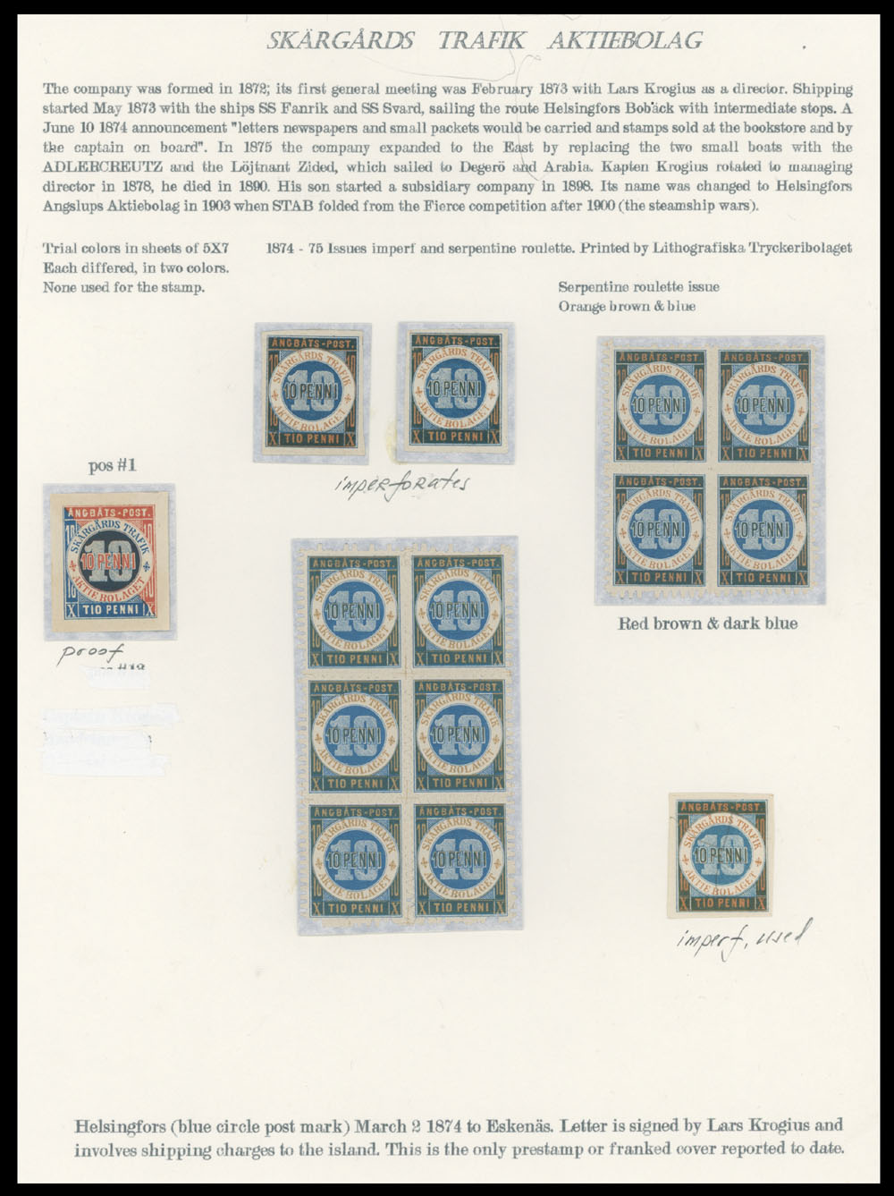 1874-86, Skargards Trafik Aktiebolag (STAB), 10p in two major shades orange brown and blue or red brown and dark blue, 20 stamps, including one proof, three imperforates (one – pen cross cancelled), two blocks of four and six, plus one cover (defected) bearing imperf stamp, all arranged on two pages from a Collection, minor perf tip flaws, still nice and clean unit, full/part of OG or used, F/VF, Lape #76, Est. $500-$600