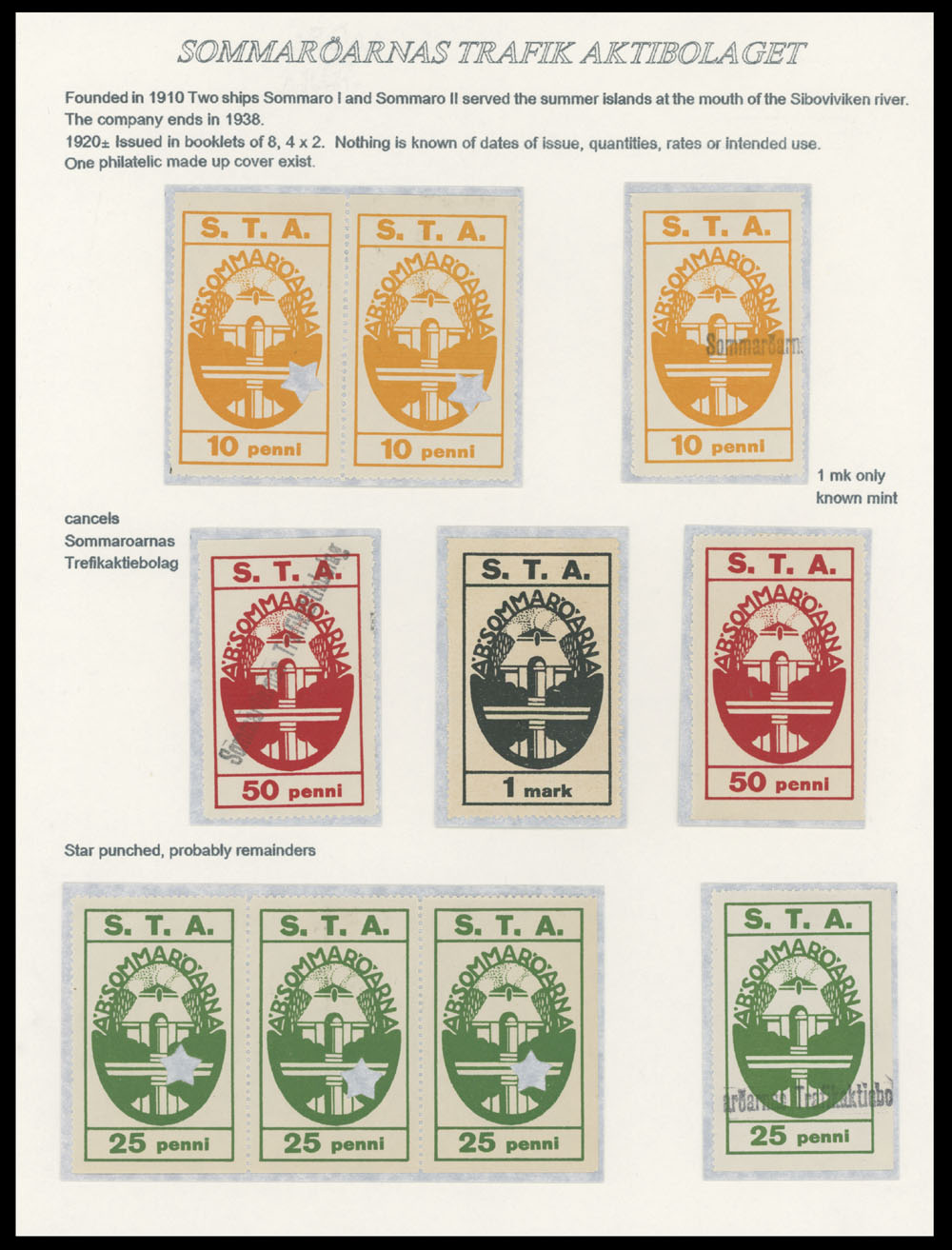 1920(c), Summer Islands Transport Company (Sommaroarnas Trafik Aktibolaget), 10p orange – used single and horizontal pair with star punch (probably from the remainders), 25p green – used single and horizontal strip of three with star punch, 50p red – unused and used singles, 1m black – unused single (reportedly unique), imperforate at one or two sides (came from booklet panes of eight (4×2), all mounted on page from a Collection, no gum as produced, VF, Lape #83-86, Est. $300-$400