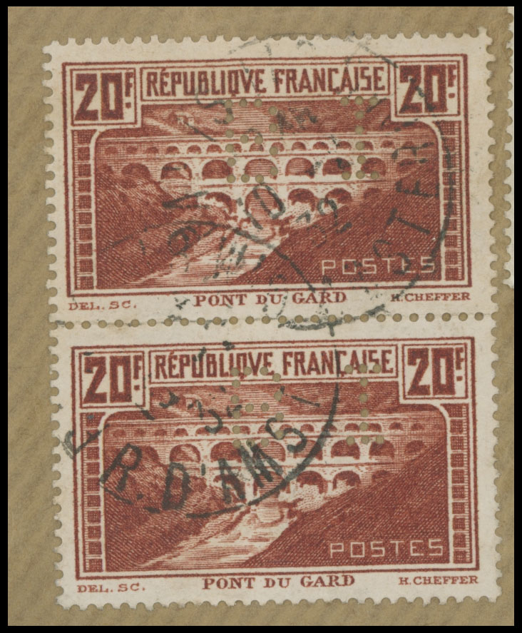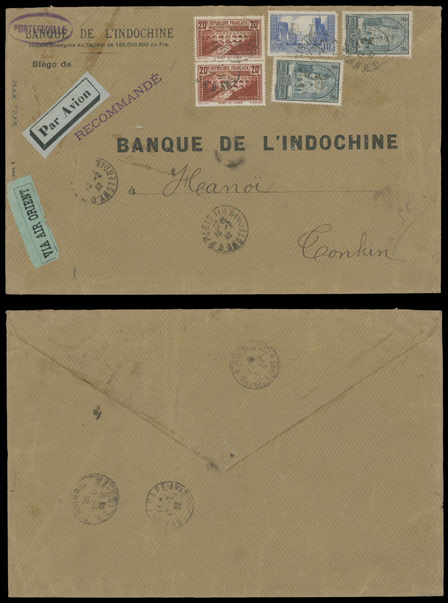 1932, Port du Gard 20fr red brown, vertical pair of type I and three other high values, all with ”B I” perfins, used on air mail cover from Paris to Hanoi via Amsterdam, transit and arrival markings, mostly VF, Est. $200-$250 , Scott #253