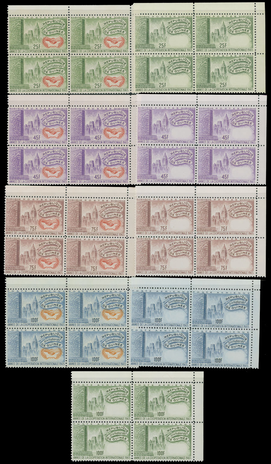 1965, International Cooperation Year, 25fr-75fr and 100fr, postage and air post, two complete sets of four, one set has all stamps with orange color omitted, in addition proof of air post stamp of 100fr in green color only, all are in top right corner sheet margin blocks of four, full OG, NH, VF, Est. $200-$250, Scott #394-96, C75, var