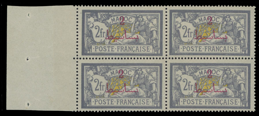 1916, red surcharge 2(p) on 2fr gray violet and yellow with omitted black overprint ”Protectorat Francais”, left sheet margin block of four, nice centering and post office fresh, full OG, NH, VF, C.v. $900 as singles, Est. $400-$450, Scott #53b