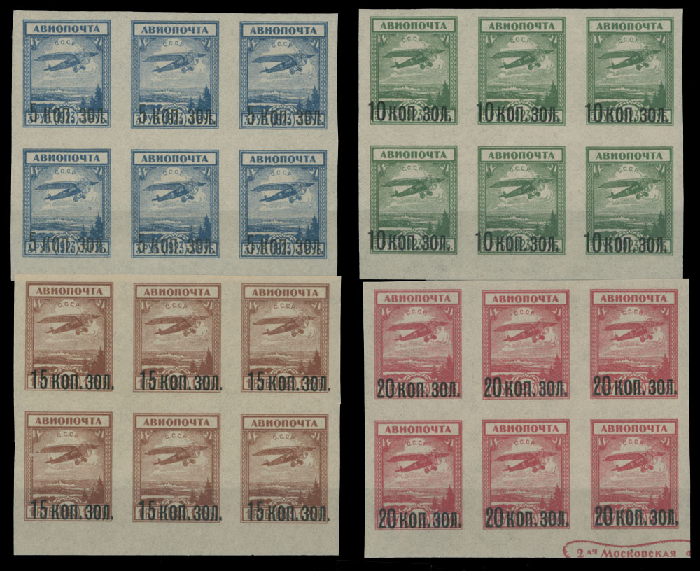 1924, Fokker F.III, black surcharges 5k/3r-20k/10r, complete set of four, bottom sheet margin blocks of six (3×2), full OG, NH, VF, C.v. $315++, Est. $300-$350 , Scott #C6-9