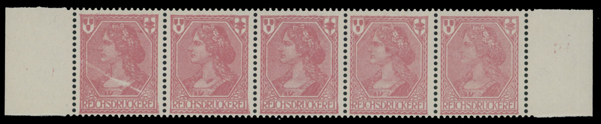 1900(c), Germania test stamp essay by Goebel, no value indicated in rose, imprint ”REICHSDRUKEREI” at bottom, side sheet margin horizontal strip of five on paper without watermark, left stamp with printer’s flaw through the design, full OG, NH, VF and rare multiple, the similar single essay was sold on C. Gaertner Auction in February 2024 for €100 plus appropriate commission (lot #10000), Est. $500-$600
