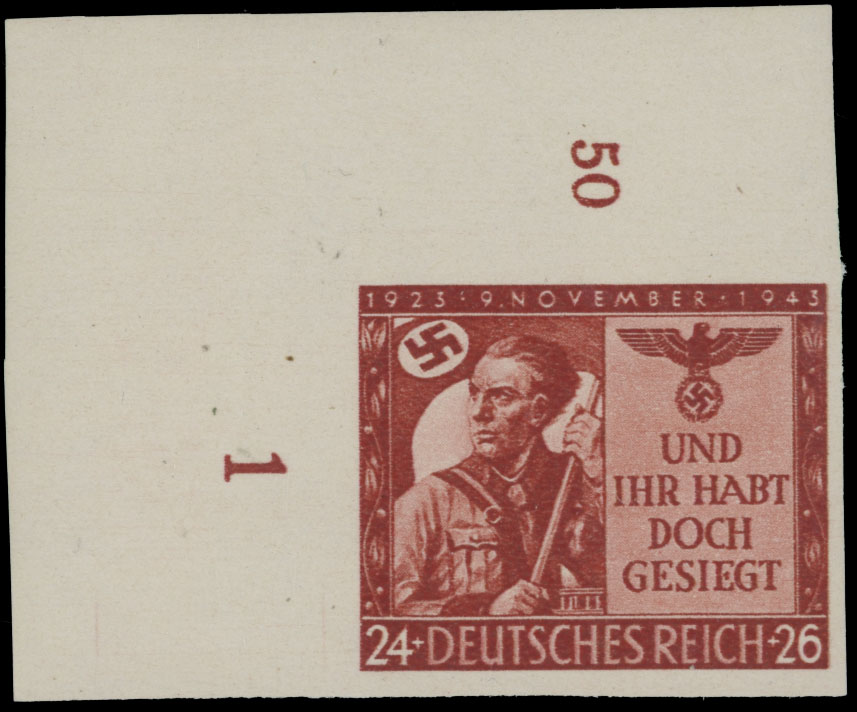 1943, 20th Anniversary of the Munich Nazis putsch, 24+26pf brown red, top left corner sheet margin imperforate single, full OG, NH, VF and rare positional piece, Mi #863U, C.v. €350, Est. $250-$300 , Scott #B250 imp