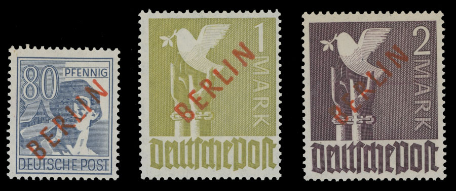 1948-49, red diagonal overprint ”BERLIN” on 80pf, 1m and 2m, set of three high values, full OG, NH, VF, C.v. $288, Mi #32-34, C.v. €980, Est. $150-$200 , Scott #9N32-34