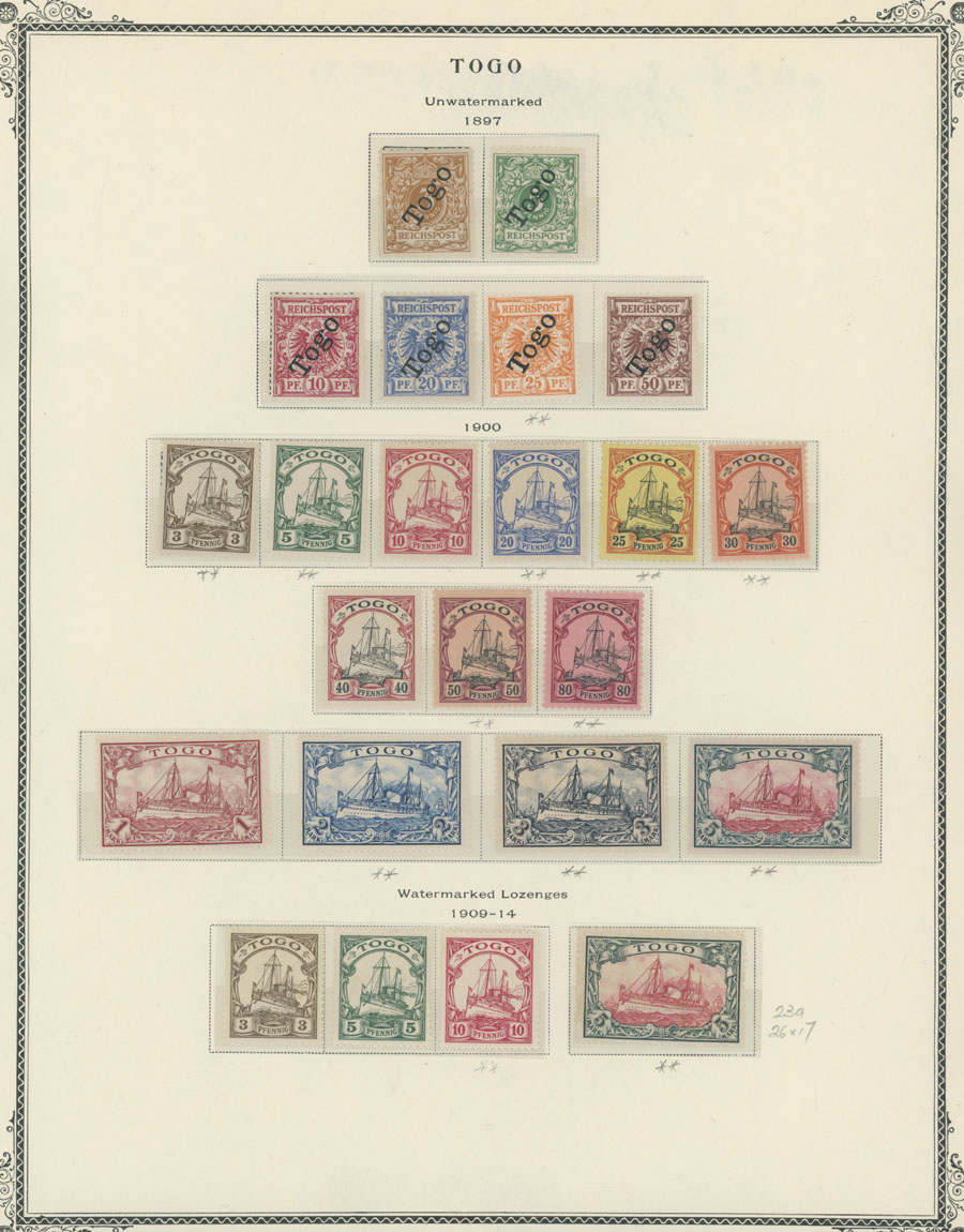 1897-1919, Scott Album page bearing 23 mint stamps, including three complete issues – diagonal ”TOGO” overprints, Kaiser Yachts on paper without watermark and on watermarked Lozenges paper, all with full OG, NH (marked **) or LH/hinged, F/VF, C.v. $840, Est. $300-$400, Scott #1-23a