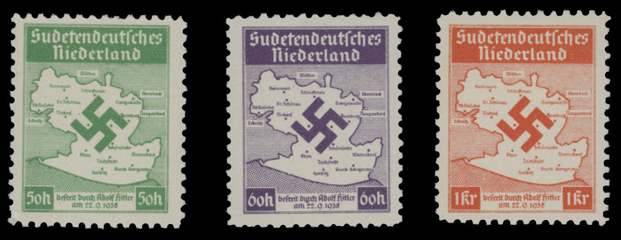 1938, German Lowlands, 50h green, 60h violet and 1kr red, unissued complete perforated set of three, full OG, LH, VF, Mi #IA-IIIA, C.v. €400, Est. $200-$250