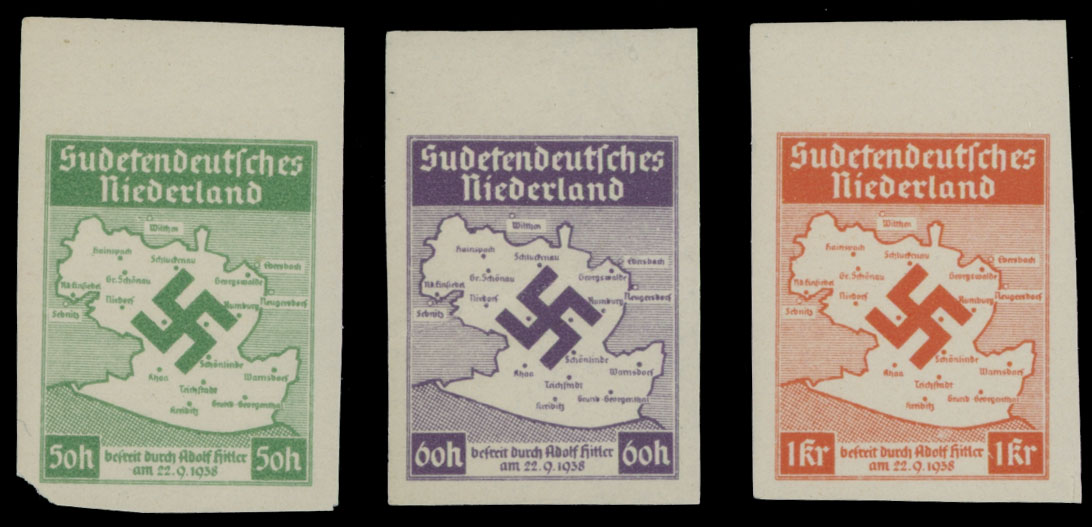 1938, German Lowlands, 50h green, 60h violet and 1kr red, unissued complete imperforate set of three, all with top margins, 50h rounded corner, 60h crease, otherwise full OG, NH, F/VF appearance, Mi #IB-IIIB, C.v. €650, Est. $150-$180