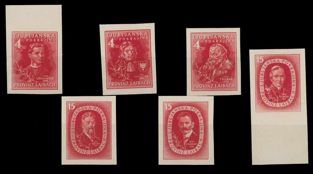 1945, Great Personalities, 4c x3 and 15c x3, complete set of six imperforate trial color proofs printed in red on white cardboard, no gum as issued, NH, VF, Mi #I V- VI V, C.v. €1,800, Est. $600-$700
